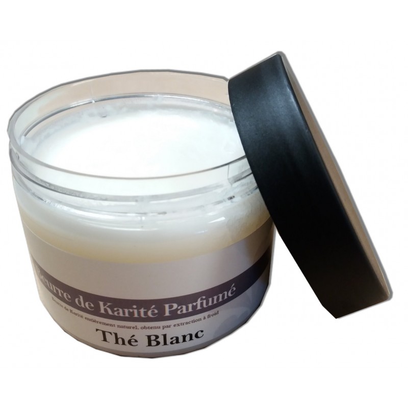 Pour un soin sur des peaux sèches, Beurre de karité parfum thé blanc, en pot de 150ml, idéal pour freiner l'apparition des vergetures.