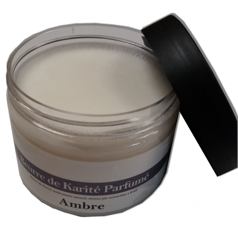 Pour un soin sur des peaux sèches, Beurre de karité parfum ambre, en pot de 150ml, idéal pour freiner l'apparition des vergetures et adoucir la peau.