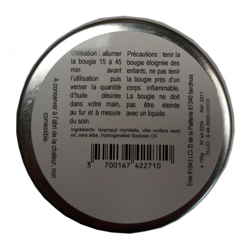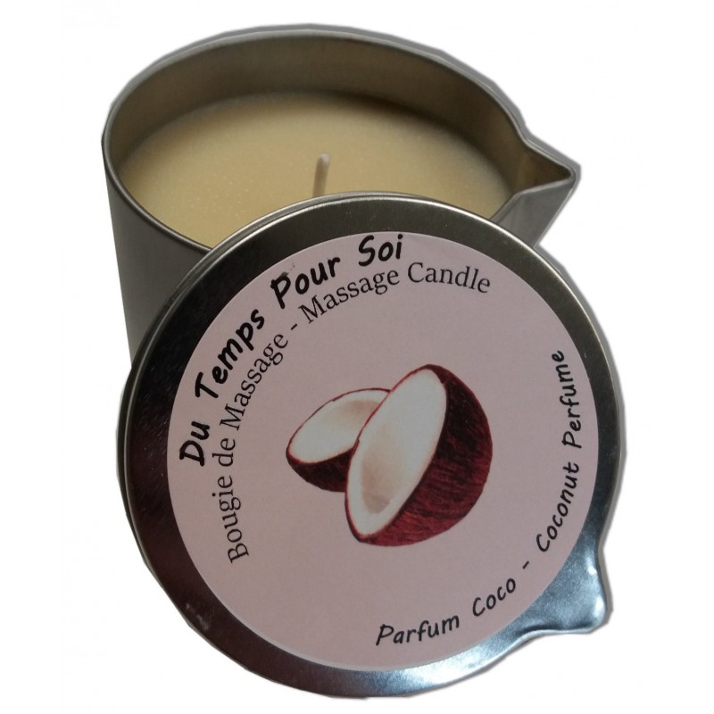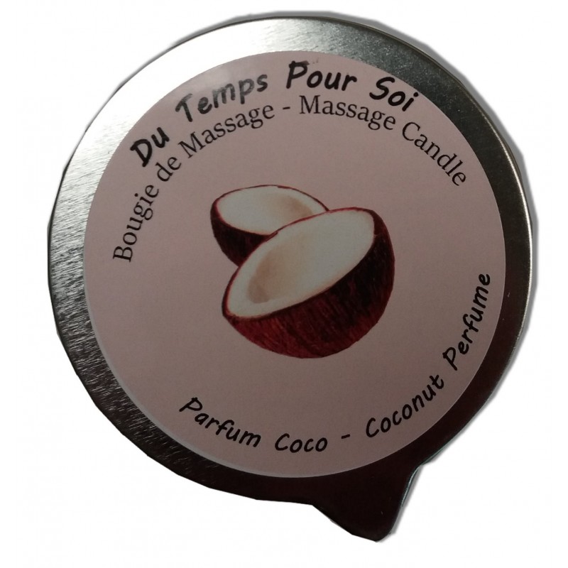 Bougie de massage au parfum Coco, la bougie est présentée en boite métallique refermable. Un produit Du-temps-pour-soi