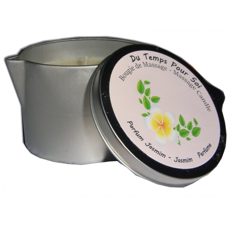 Bougie de massage au parfum Jasmin présentée en boite refermable.
