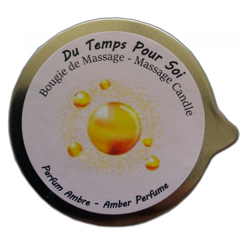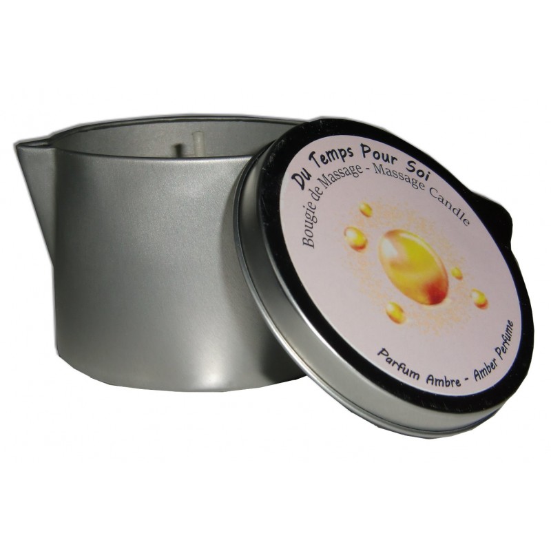 Bougie de massage 150 g au parfum Ambre dans son emballage étanche et refermable.