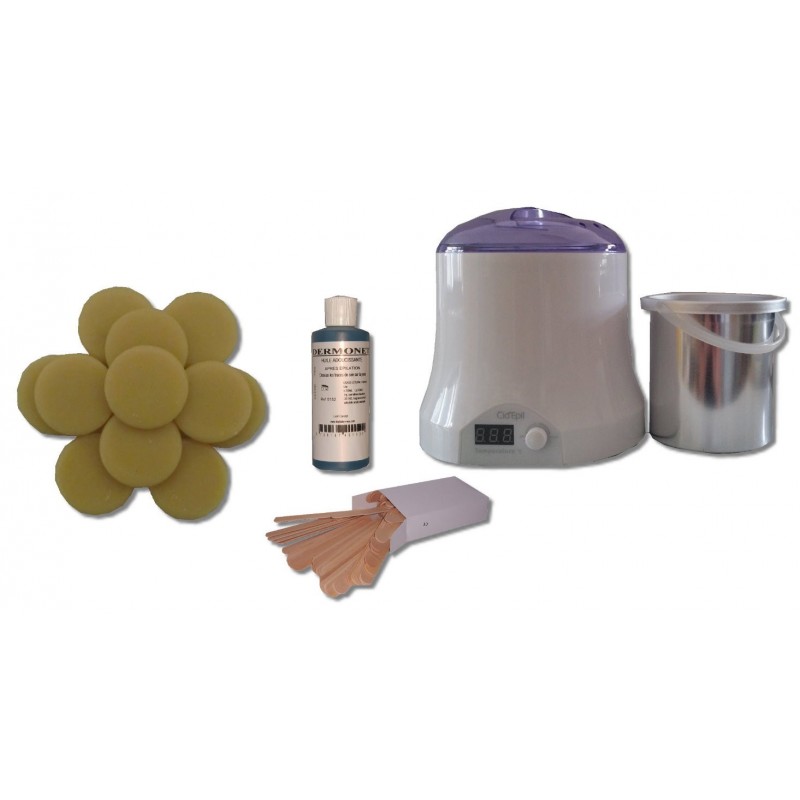 Kit épilation complet prêt à l'emploi avec son chauffe cire 800 ml, Cid Epil, 1 kg de cire à épiler pelable Blonde en galets. 200 ml d'Huile corporelle et 100 spatules pour le corps.