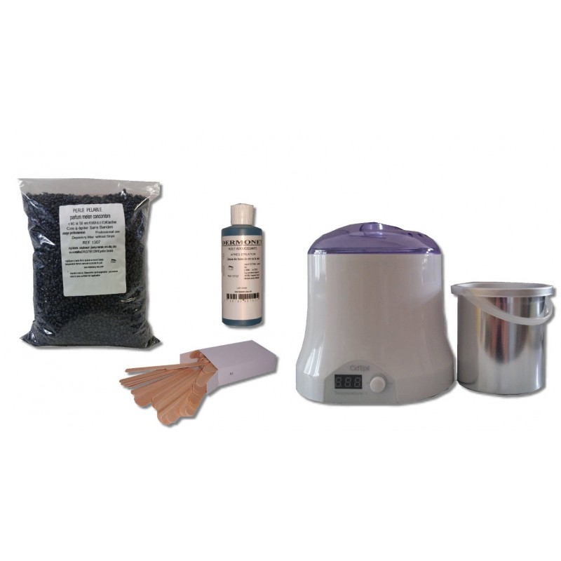 Kit épilation complet avec son chauffe cire 800ml Cid Epil, 1 kg cire à épiler pelable Melon Concombre en perles. 200 ml d'Huile post épilation et 100 spatules pour appliquer la cire sur le corps.