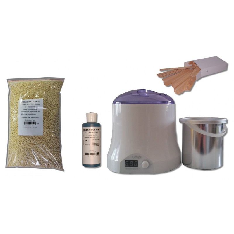 Kit épilation complet avec son chauffe cire 800ml Cid Epil, 1kg de cire à épiler pelable Blanche en perles. 200 ml d'Huile post épilation et 100 spatules.
