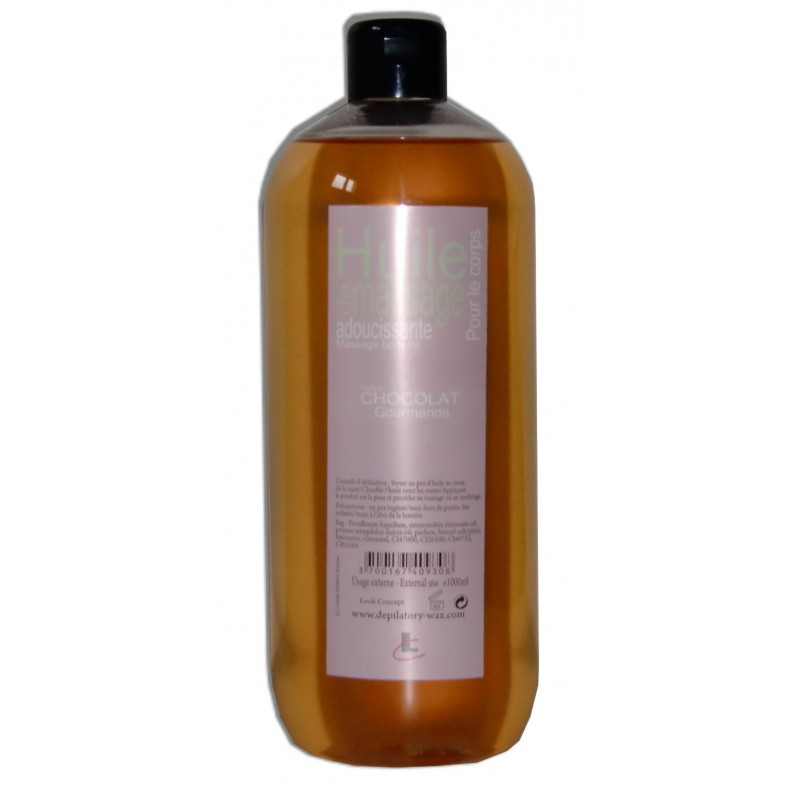 Huile de massage adoucissante au parfum chocolat. Pour un usage professionnel en flacon d'un litre