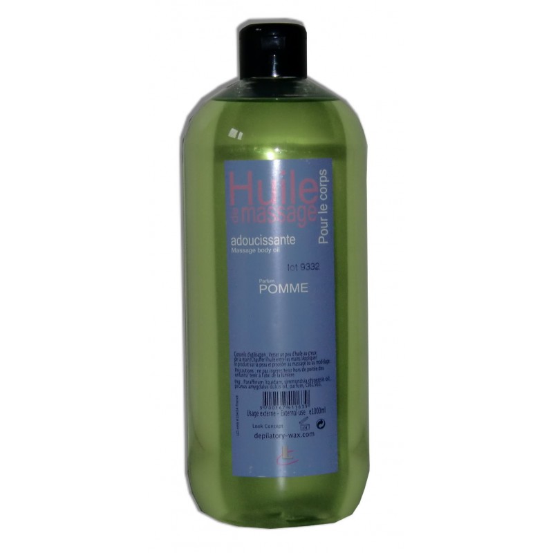 Flacon professionnel d'un litre d'huile de massage adoucissante au parfum Pomme.