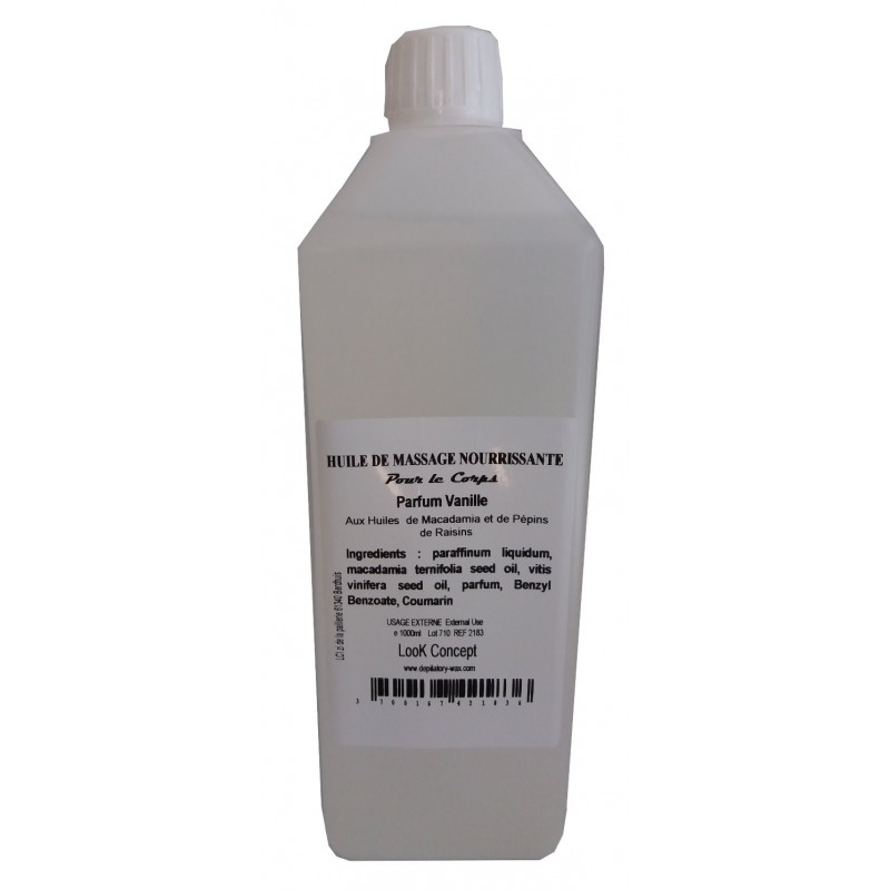 Flacon d'un litre d'huile de massage nourrissante, professionnelle au parfum de la vanille.