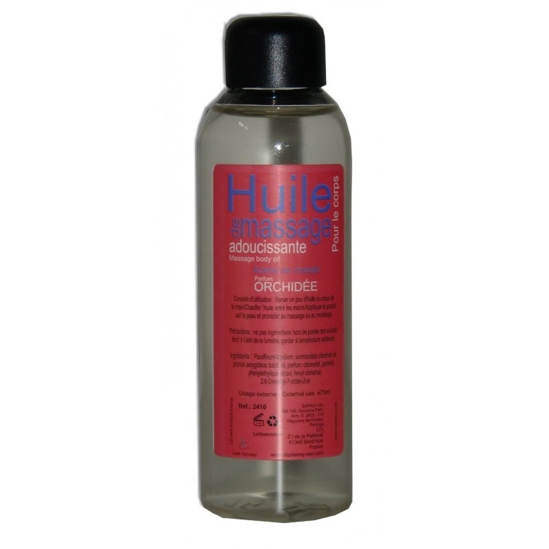 Flacon de 75 ml d'huile de massage professionnelle adoucissante au parfum Orchidée au format 75 ml, idéal pour tester et découvrir de nouveaux parfums.