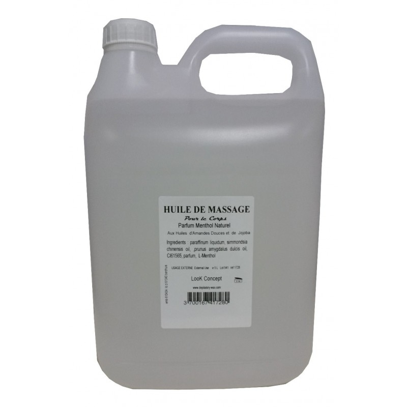 Flacon de 5 litres d'huile de massage professionnelle, adoucissante au parfum Menthol et enrichie aux huiles d'amande douce et de jojoba.