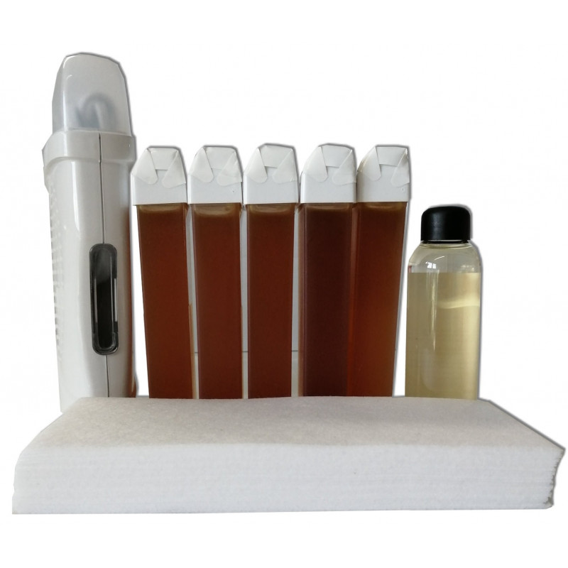 Kit épilation à la cire tiède avec ses cinq recharges de 100 ml au miel, une épilation douce avec bandes. Parfait pour une épilation à la maison, pas cher et pratique. Du matériel professionnel !